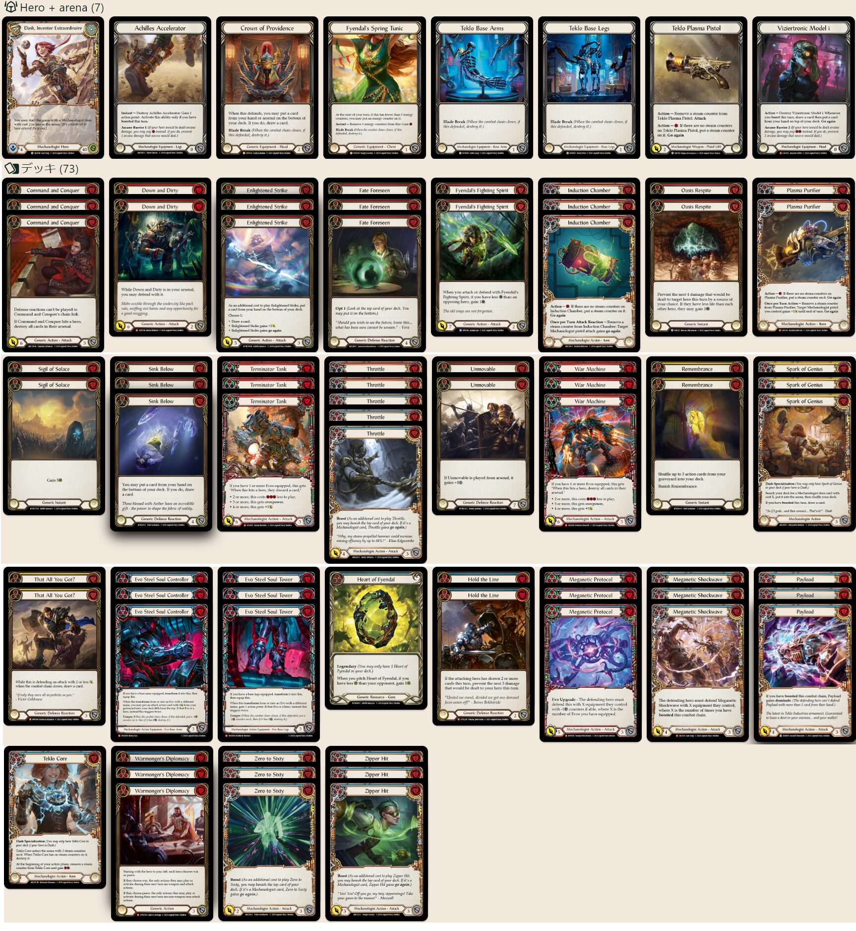 「デッキがほぼ無くなる現象」、「デッキが減っていく現象」、「デッキの中のカードが攻撃に使っても弱いカードしか残ってない状態」等を「Fatigue(ファティーグ)=和訳:疲れ」と呼びます。「Flesh and Blood」(以下FaB)はライフを0にしたほうが勝ちのゲームです。なので他のカードゲームの用にデッキ切れは敗北に直結しません。が、自分だけデッキが切れた状況は多くの場合、負けを意味します。例えばお互いライフが10以上ある中で、相手はデッキがまだ20枚近くあり、自分はデッキが切れて手札が4枚だけでしか戦えない状況だと…もう相手のライフを削りきる手段はなく相手が勝つ訳ですね。そのようにして、相手を「Fatigue」することによって勝つことを目指しているデッキを「Fatigueデッキ」と呼びます。