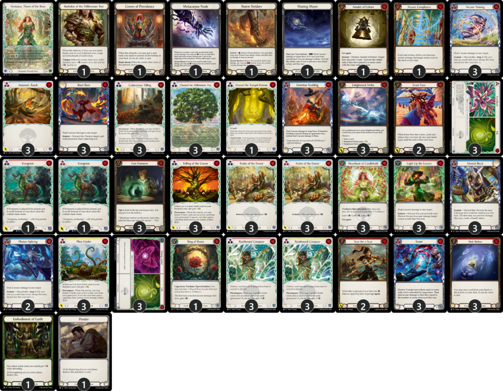 《嵐の闊歩者》などのLegendary装備は採用せず、純粋なミッドレンジデッキとして組んでみました。装備品などの出力で劣る分、早々に《ヴァーダンス》の能力を有効にすることを意識して「腐解」カードを多めに入れてます。Mレアは《王位の切り倒し》《薔薇の指輪》など替えが利かないカードは採用しています。