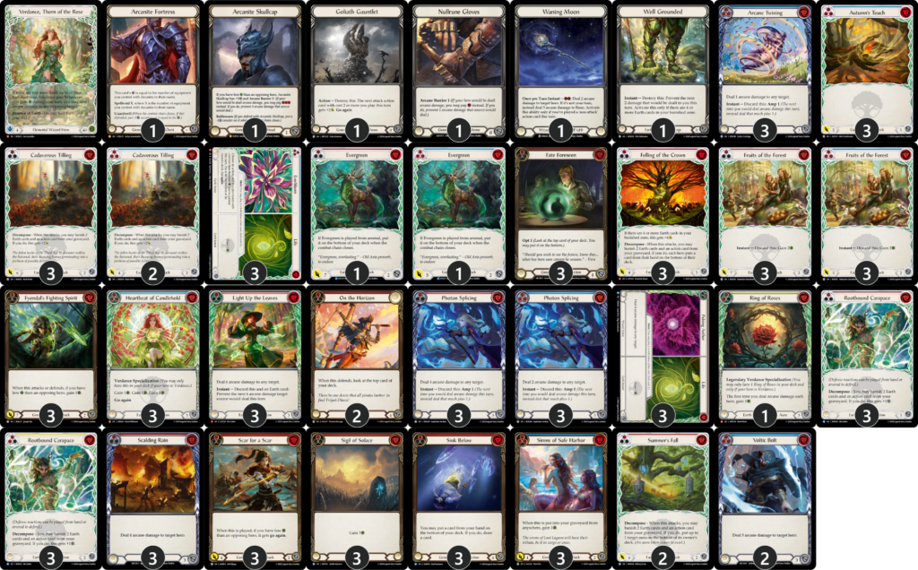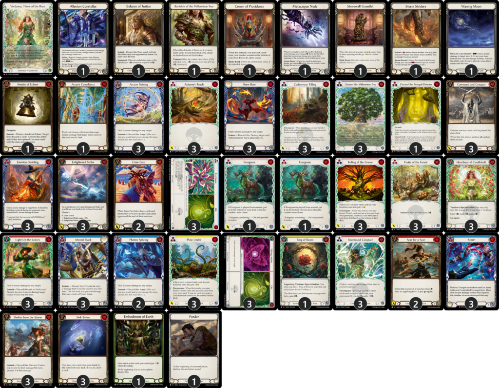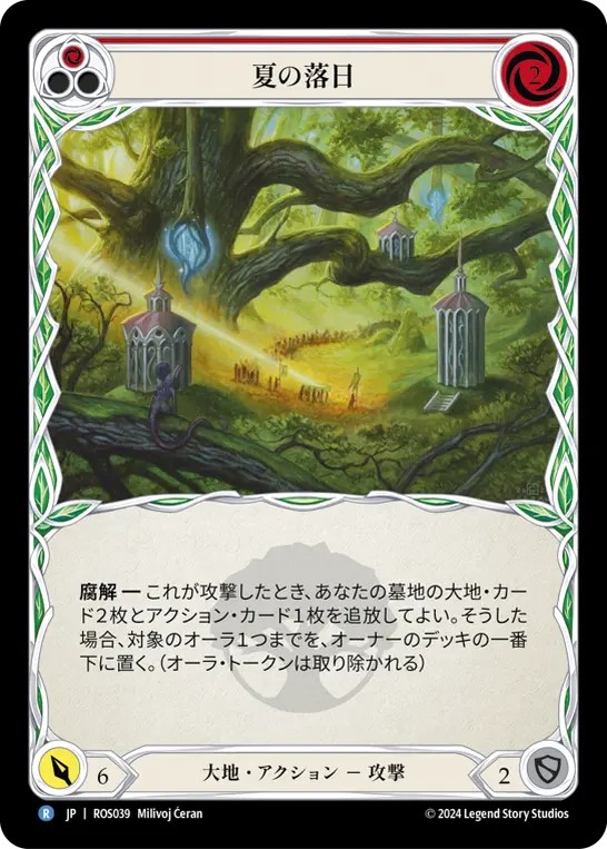 この能力を有効にするためにはまず墓地に大地2枚以上とアクションカードを1枚以上用意してから、「腐解」能力を使用していく必要があります。そのため《秋の知らせ》《森の果実》のような大地カードや、《王位の切り倒し》《絡み根の外殻》といった「腐解」カードが基本的に採用されます。