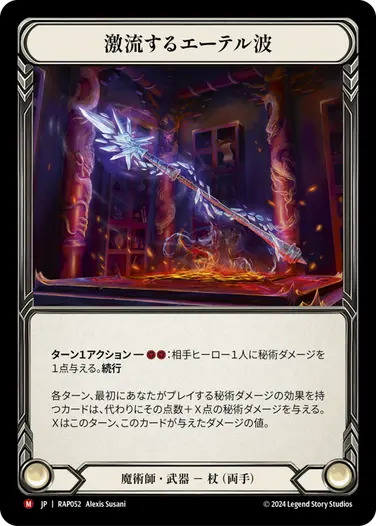 武器《激流するエーテル波》を装備すると、増幅を実質2回乗せることが可能になるため、上記のコンボをする時に装備されます。《激流するエーテル波》を装備していた場合、上の例だと《蔓延/生命》が2枚でも、増幅18を乗せた《激流するエーテル波》の19点の後、次の秘術ダメージを与えるアクションにも+16-19点が狙えます。