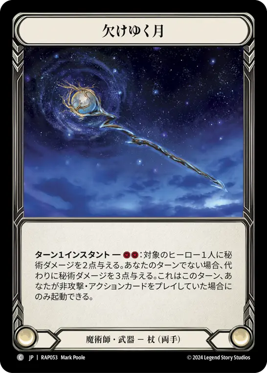 秘術ダメージを与えると1点回復してくれるオーラ。概ねほとんどの秘術ダメージカードに+1点分の得を与えると書いているようなものであり、ゲーム早期に設置できると大きく有利になります。特に、《ヴァーダンス》の能力達成後は自アクションフェイズに秘術ダメージを与える→《薔薇の指輪》で1点回復→《ヴァーダンス》の能力で1点秘術ダメージが飛ぶ、とこれ1枚で2点稼ぐ計算になり、勝因になりうるパワーを持っています。これをプレイするとアクションポイントはなくなってしまいますが、《欠けゆく月》は起動可能です。