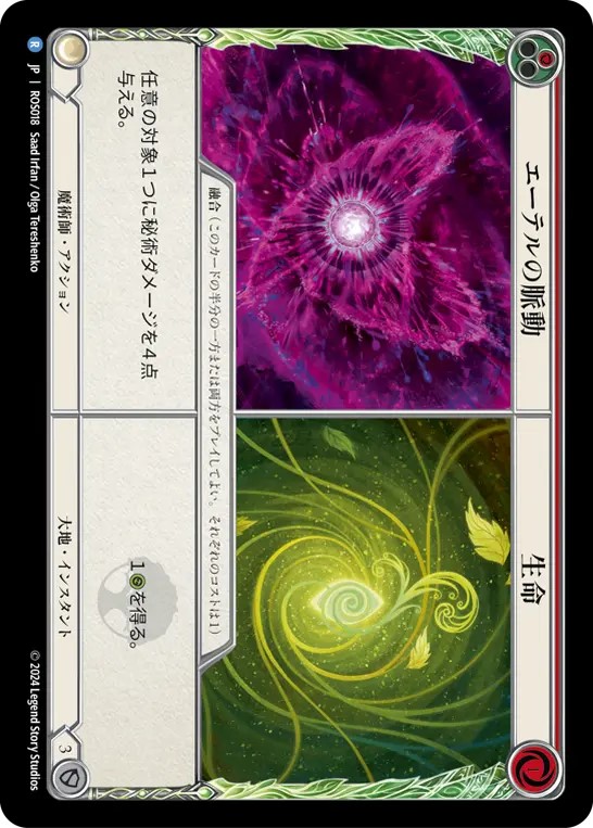 例えば《エーテルの脈動/生命》を融合でプレイした場合、先に《生命》から解決されます。この時、もし《ヴァーダンス》の能力が有効になっていた場合、《生命》で1点回復→《ヴァーダンス》の能力が誘発し1点秘術ダメージ→《エーテルの脈動》の4点秘術ダメージという順番になります。