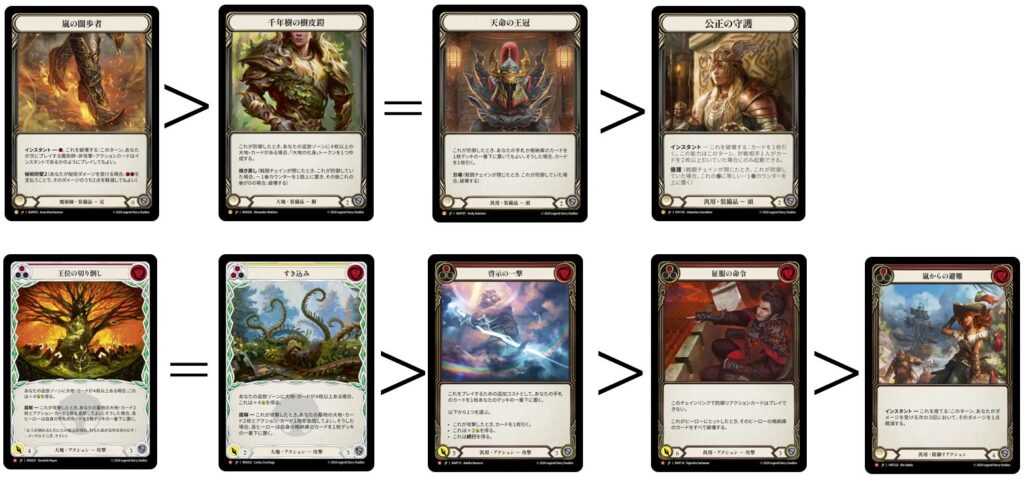 「大地」タレントといえばこの2枚。アグロ相手に防戦一方になっていても、これらをプレイできれば一気に逆転できるキーカード。特に《王位の切り倒し》は打点も高く、相手の格納庫が空でも強力なので、どんな状況でも頼りになります。