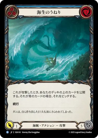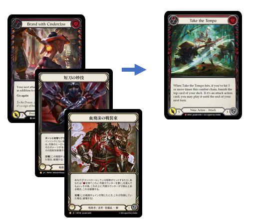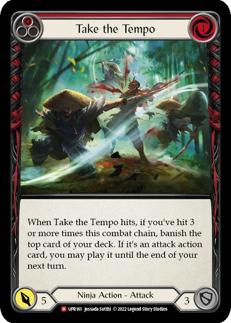 《Take the Tempo》は追加の《スナッチ》のようなカードです。ヒットした時、戦闘チェインで3回以上ヒットしていれば自分のデッキトップを追放。その後、追放したカードが攻撃アクションなら次の自分ターン終了時までプレイ可能になります。攻撃アクションが多数を占める《シンドラ》においては高確率で攻撃アクションを追放し、次のターンにプレイできるでしょう。