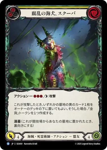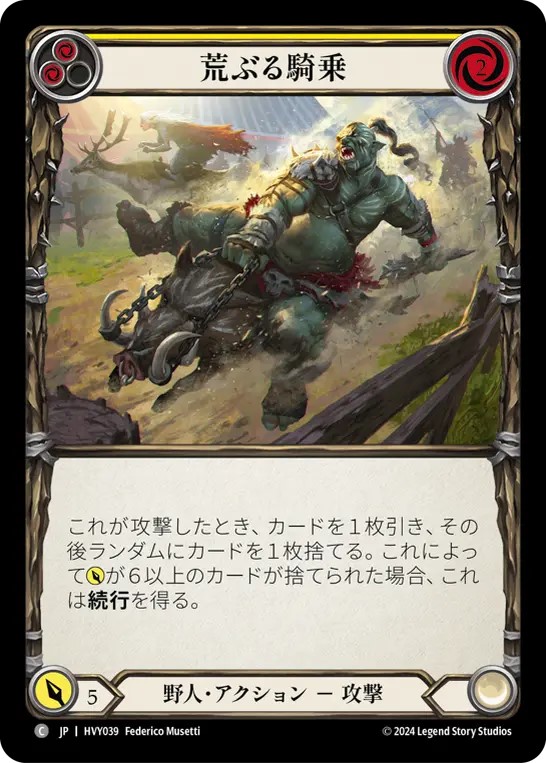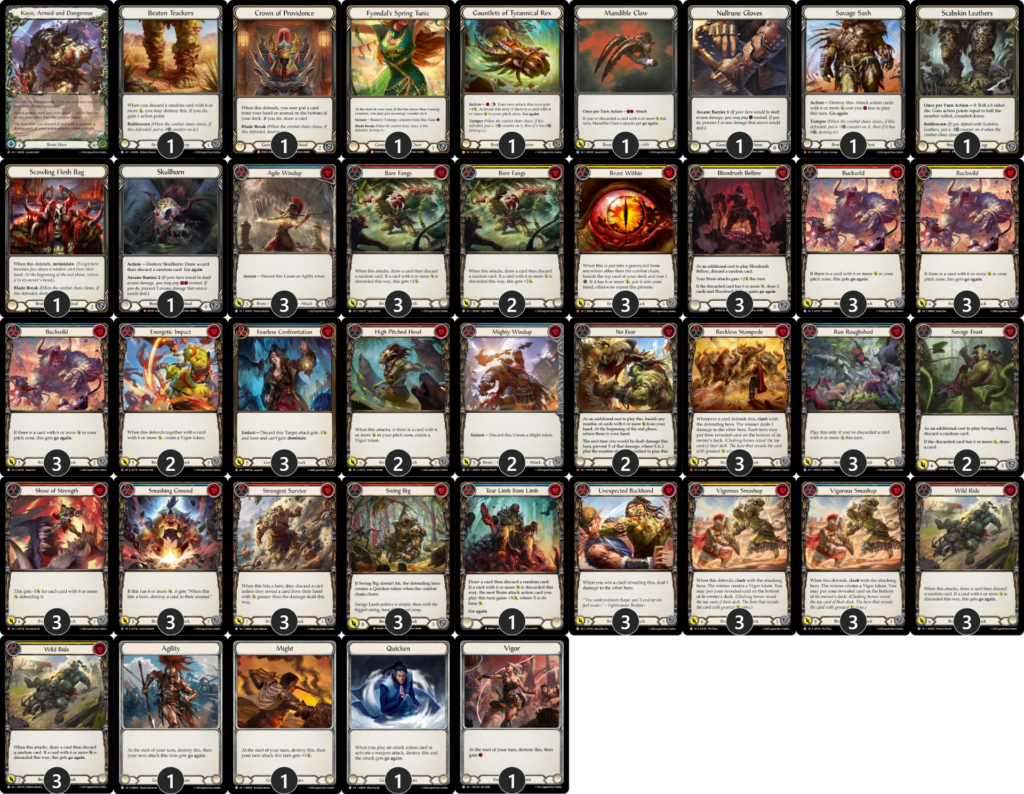 《活力》が1個出ていれば、青1枚をピッチして、2コストの続行攻撃アクション→武器3点or2コスト攻撃アクションといった手札2-3枚で強力な動きが可能です。また、胴装備《野獣の蛮帯》を起動しているターンには《活力》=2コストのAAをプレイするのに必要なリソースとなるため、非常に大きなバリューを生みます。