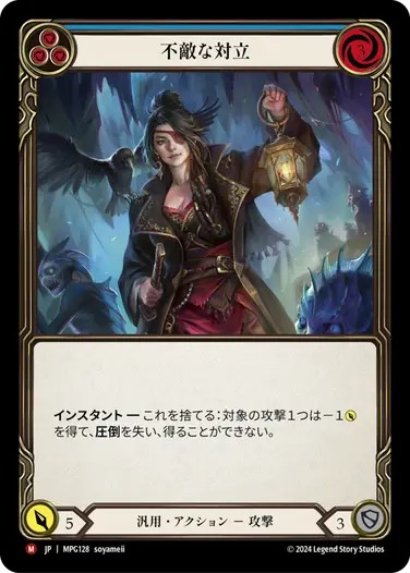 《不敵な対立》は青の攻撃値5点なので《ケイヨ》と相性が良く、《シンドラ》の《祖先からの権威》に合わせることができます。《不敵な対立》を-1点として使用するのは表現価値の面で弱い動きですが、《シンドラ》は《機運の仮面》の誘発1ドローが狙えるタイミングで《祖先からの権威》をプレイしてくることが多いため、1枚捨てて1ドローを防ぐことができていれば1:1の交換と捉えることもできます。防御リアクションを採用しづらい《ケイヨ》は《祖先からの権威》でシャクられやすいため、青の防御値3として機能しながら疑似的な防御リアクションとして機能する《不敵な対立》の採用は納得です。