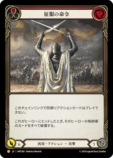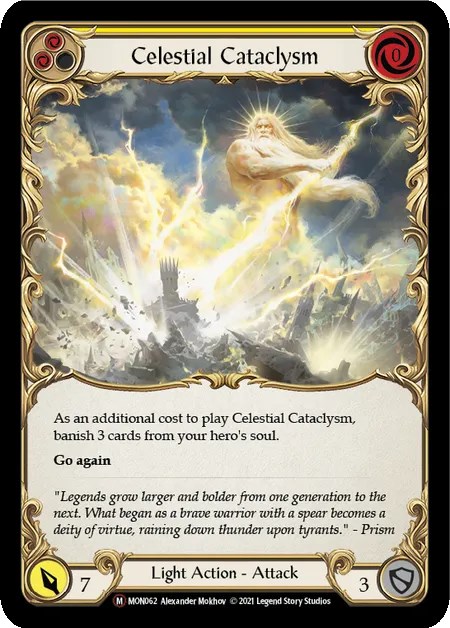 《Celestial Cataclysm》と《征服の命令》はミラーマッチのポッパーとしての役割を果たし、《Celestial Cataclysm》は防御的なヒーロー相手にソウルを貯めてから、ポップされない7点続行でリーサル手段として活躍します。《征服の命令》はアグロ相手への活躍が見込めます。特に「圧倒」を持つ《Herald of Erudition》をケアして格納庫に防御リアクションを置いてる相手に打てると理想的。