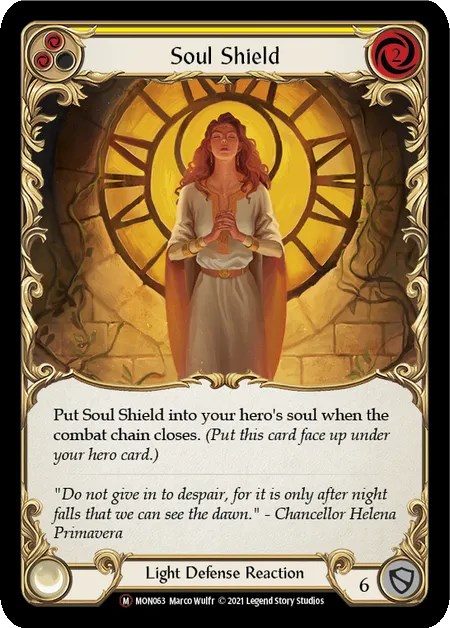 《Soul Shield》は《ケイヨ》や《グレイビィ》など6点の攻撃が多い相手に活躍が見込めます。《グレイビィ》相手には格納庫に置いておくことで《蒼海の大覇船》の格納庫破壊をケアできますし、《黄金のフック》の効果が乗った「盟友」の6点攻撃を防ぎながらソウルを貯めることもできます。
