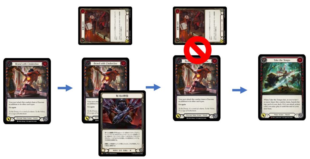 このテクニックを応用すれば、手札2枚からでも《Take the Tempo》の誘発が狙えるため、ミラーマッチなどにおいて少ない手札から相手に防御を要求することができます。ヒットしているチェインリンクではなく、戦闘チェインでヒットした回数を参照しているため、1回目の攻撃がヒット&《短刀の妙技》がヒットで2回カウントできるんですね。そのまま《Take the Tempo》がヒットすれば条件達成です。