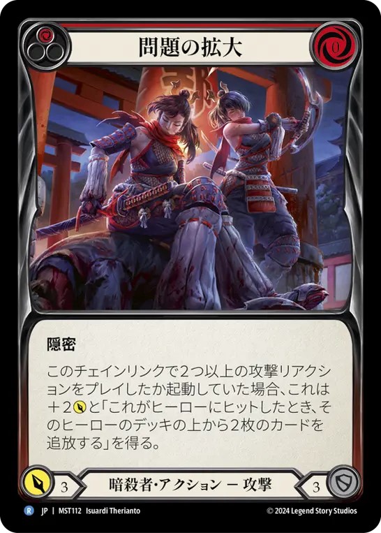 《問題の拡大》は主に0コスト5点になる攻撃リアクションとして採用しています。攻撃リアクションは装備品の起動でもカウントできるので、手札に攻撃リアクションカードがなくても腕装備《短刀の妙技》など装備品のリアクションを2回起動することでも5点にできるのは覚えておきましょう。デッキを削る能力もファティーグが絡む試合展開では強力なオプションです。