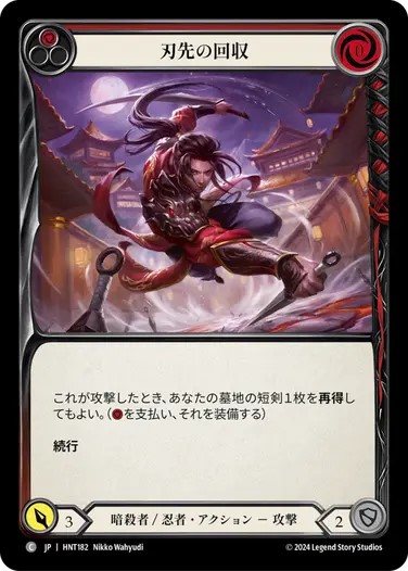 ヒット時効果は1点ライフを失わせるだけ、と控えめですが、このカードの真価は攻撃アクションなのに「短剣」タイプを持っていることです。「短剣」タイプを持つ「隠密」であることで《タランチュラの毒素》で相手の防御値を下げながら+3点が可能なため、《タランチュラの毒素》が0コスト6点相当の非常に強力なカードになります。また、《短刀の妙技》の対象に取ることも可能。