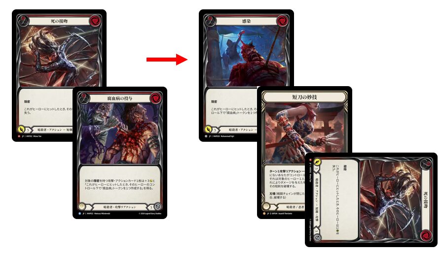 《目撃者の抹殺》+《虚弱症の魔本》、《死の接吻》+《タランチュラの毒素》+《短刀の妙技》、《惹きつける予後》+《ほんの切り傷》など組み合わさることで強いカードが多いので、それらは同時に採用できると理想的ですね。装備品については《短刀の妙技》や《フィエンダルの春のチュニック》は定番装備ですが、足装備や頭装備は「アーモリーデッキ」収録の装備品も競技シーンで使用されうる性能をしており、置き換わる可能性があります。