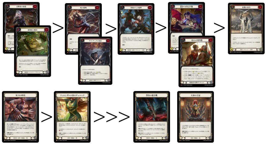 また、《征服の命令》とも好相性。青ピッチしながら《グラフェンの鋏角》で攻撃する等1リソースを使用して、2リソース浮かせて手札を空にした状況で《虚弱症の魔本》をプレイすると《征服の命令》に繋がります。相手の格納庫や手札に防御リアクションがありそうなときは、《目撃者の抹殺》は防御リアクション1枚との交換になってしまうため、特に《征服の命令》のパターンが有効です。