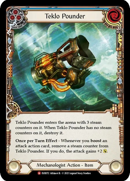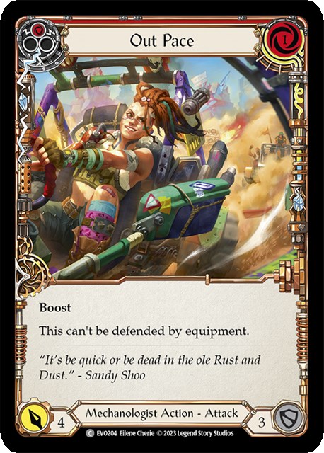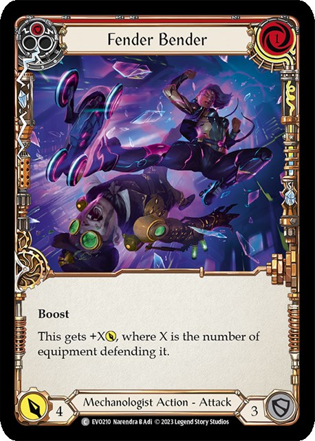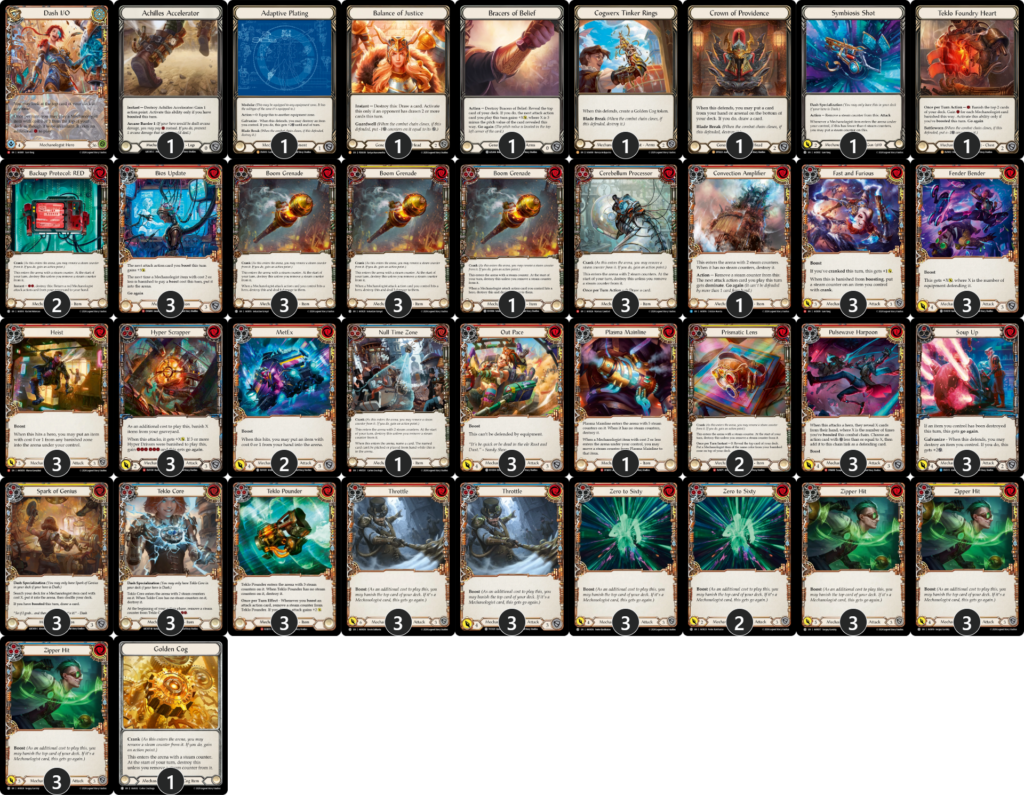 カードや色比率の観点では、1コスト4点の攻撃アクションを軸にしています。1コスト4点3枚+青で12点を出しながら、胴装備《Teklo Foundry Heart》を起動して《ダッシュI/O》の能力でアイテムを展開しつつ武器で2点、という動きを再現性高く行いやすい構築です。ブレイクポイントの考えに忠実で、特に装備品による防御を抑制する《Out Pace》と《Fender Bender》を6枚体制で採用しているのは《ケイヨ》や《カッサイ》など装備品が硬いヒーローに有効。
