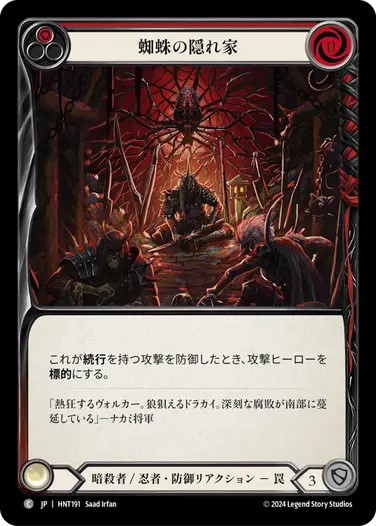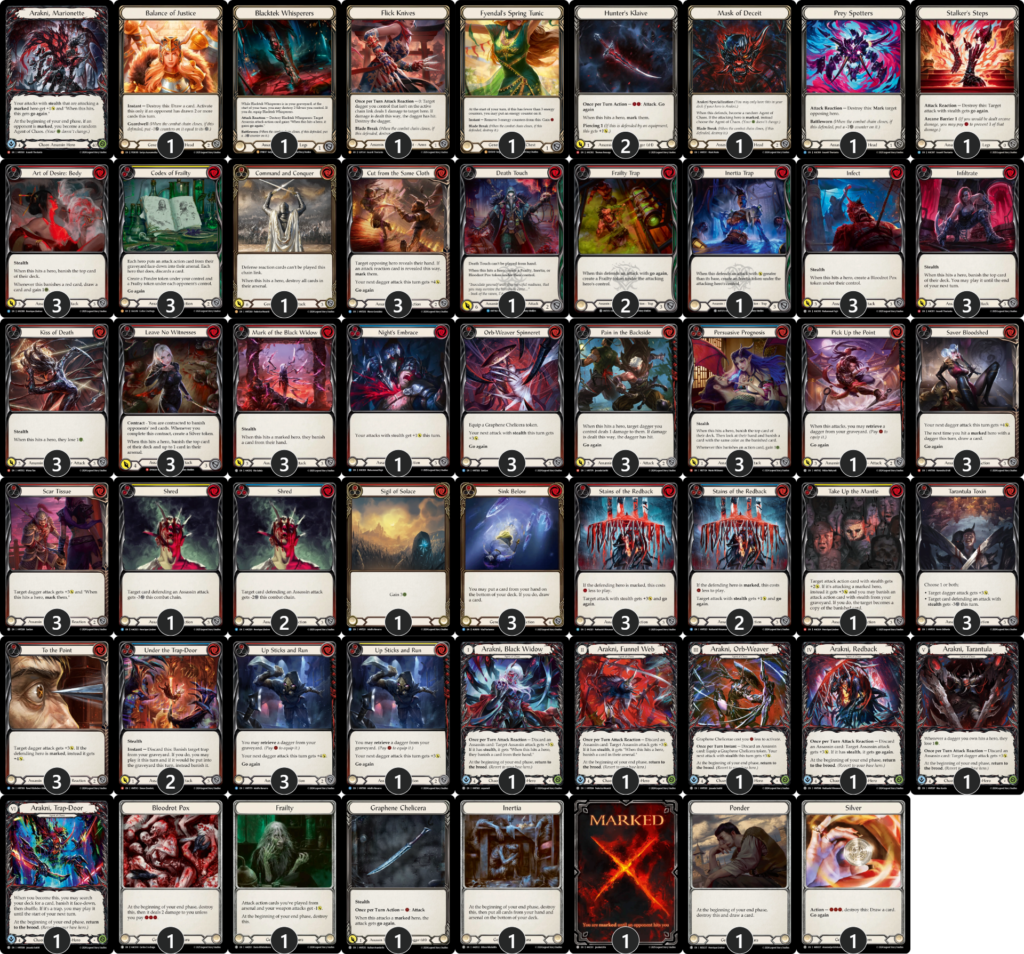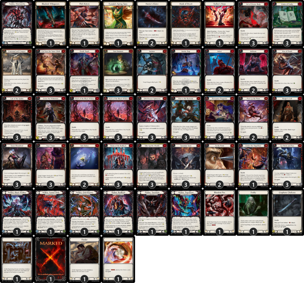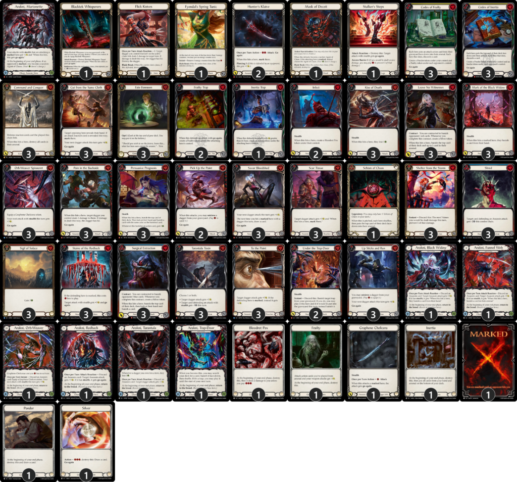 とはいえ弱点もあり、優勝した《フローリアン》のような防御リアクションを12枚も採用しているようなデッキに正確に防御され続けると、ヒット時効果のバリューが出せず、不利になります。また、《グレイビィ》の「盟友」戦略も苦手です。特に《陽気な副船長、チャム》は《流血の陶酔》などの非攻撃アクションによる短剣強化を見てから起動することが可能で、《傀儡・アラクニ》にとっては嫌な「盟友」になります。他、アグロデッキでは《ダッシュI/O》などは《タランチュラの毒素》などの攻撃リアクションと付き合わずに殴り合いに持ち込んで、妨害効果持ちの攻撃アクションは硬い装備品で防ぎやすいため、五分の勝負に持ち込めます。逆に言うと、それらの特性を持たないヒーローには基本的に優位に立ち回り易く、また、上振れやプレイ次第で苦手なヒーローも突破可能な高いポテンシャルを持っているヒーローでしょう。