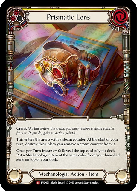 特徴的なカードとしては《Prismatic Lens》が採用されています。こちらのテキストは「自分のデッキトップを公開し、公開したカードと同じ色の機械技師アイテムを追放領域からデッキトップに置く」という能力です。この能力を活かせば、《高性能手榴弾》、《小脳プロセッサ》、《Teklo Pounder》などの強力なアイテムをデッキトップに置いて、《Bios Update》や《ダッシュ I/O》の能力でアクションポイントを使わずに展開することが可能です。配信卓を見ると、どうやらアグロ相手には《Prismatic Lens》をサイドインしていなかったので、セットアップ用のカードのようです。