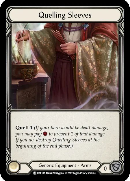 面白いカードとしては腕装備《Quelling Sleeves》が採用されています。こちらは「Quell 1」という能力のみをもつ汎用装備で、ダメージを受けた際に1リソース払うことで1点ダメージを軽減でき、その能力を使ったターンの終了時に破壊されるというテキストです。