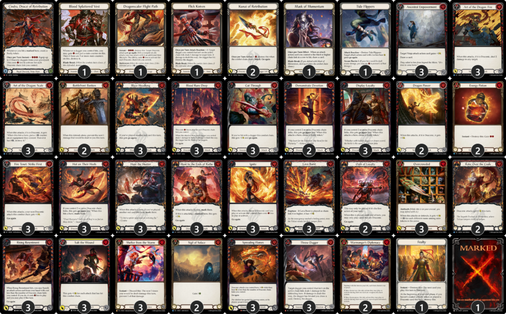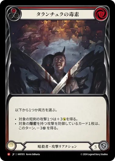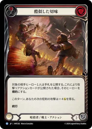 それらの強力なMレア以外にも、《酷似した切味》や《逃げ支度》のような、0コストで短剣を4点強化するカードをプレイした後に、《フィエンダルの春のチュニック》から出したリソースや3番の能力で、カードをピッチせずに《グラフェンの鋏角》で攻撃すれば、消費手札1枚につき4点+1点の攻撃が可能で、まるで忠義達成後の《ファング》や《アウローラ》のような打点が出せます。上記のような強みを持つため、これらの主要カードは3名とも3枚ずつ採用していますね。