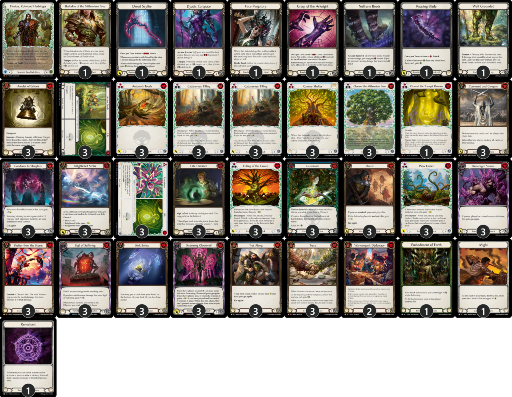 12枚の防御リアクションと、青いカードは非攻撃アクションを多く採用しており、《大地の化身》トークンのバリューを上げているのが特徴で、《フローリアン》の中でも非常に防御力を高めたリストに仕上がっています。この調整により《傀儡・アラクニ》や《ダッシュ I/O》、《ケイヨ》などの環境のアグロデッキに非常にガードが上がっています。