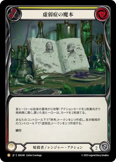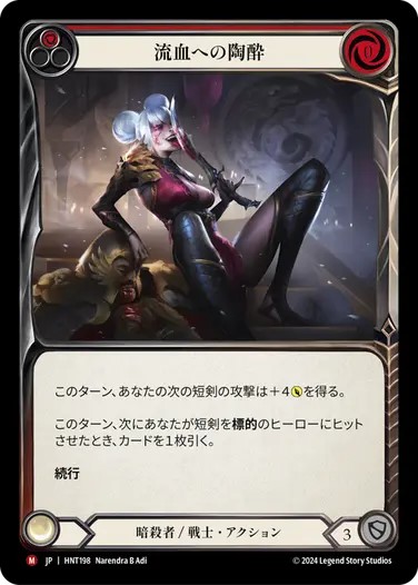 多少手札のムラやランダム変身によるムラはあるものの、《流血の陶酔》や《虚弱症の魔本》などのパワーカードを使用した高い出力に加えて、暗殺者クラスの妨害も持ちます。ダガーによる攻撃をした際、そこに攻撃リアクションが複数枚乗るのか、そのあとの攻撃アクションが本命なのかといった裏目も兼ね備えており、相手のミスに突け込みやすい性質も強み。