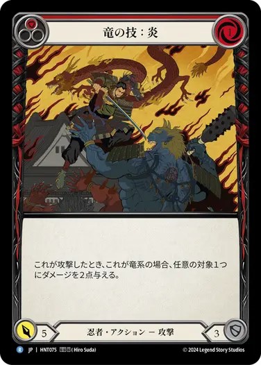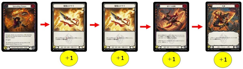 その一つが《Spreading Flame》。青をピッチして《報復のクナイ》を振る動きと《Spreading Flame》の竜系チェイン数を参照して竜系の攻撃を強化する効果は非常に相性が良いです。《Spreading Flame》からプレイ→《報復のクナイ》で2点→《報復のクナイ》で2点→《迫りくる追跡》などの竜系3点が4点に…と強力なビッグターンを作ることができます。