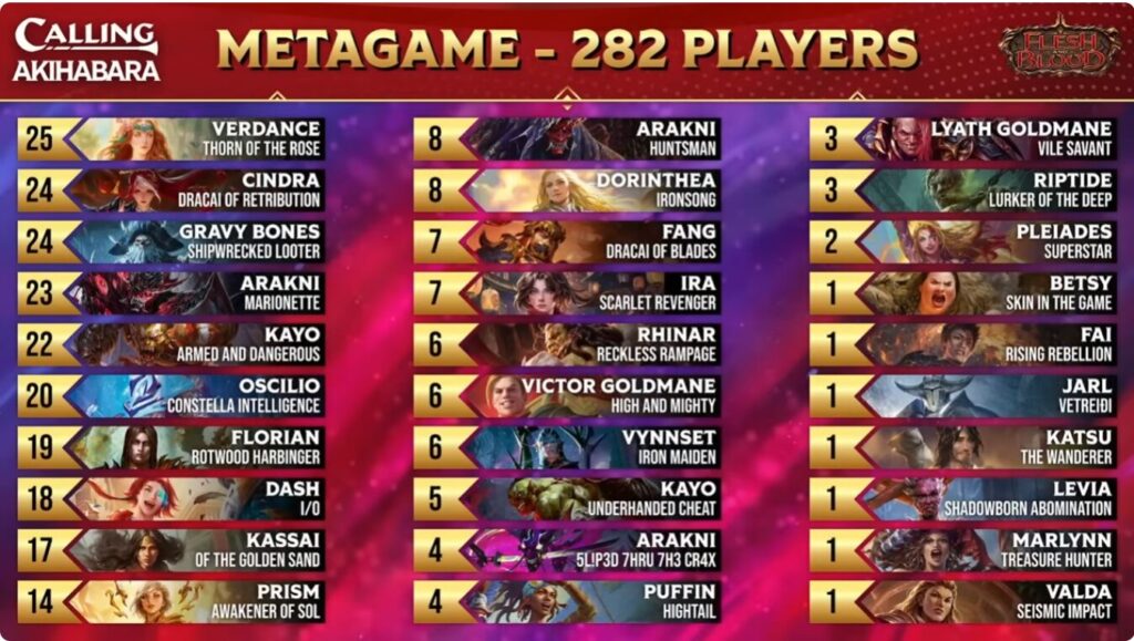 いわゆる「群雄割拠」環境と言えるでしょう。FaBの競技シーンでもここまでヒーローが均等に散る大会は珍しいです。