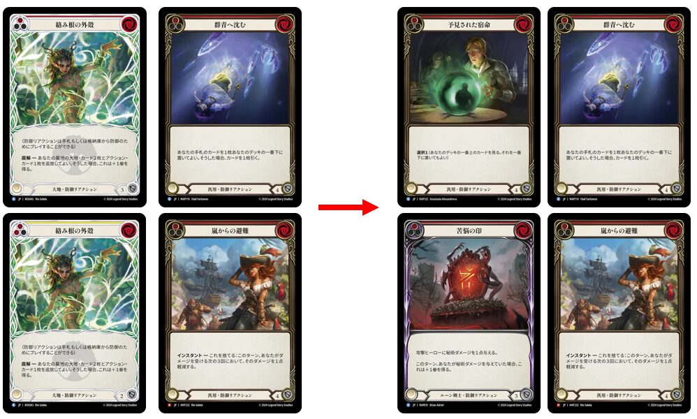 元々ミッドレンジフローリアンは《絡み根の外殻》赤黄6枚と、《群青へ沈む》3枚、《嵐からの避難》3枚の防御リアクションを採用しているのが主流で、防御リアクション12枚体制だったところに、《絡み根の外殻》の6枚を失いましたが、その枠に《予見された宿命》と《苦悩の印》を採用しており、改訂前と変わらぬ防御力を保つ、という調整の意図を感じます。