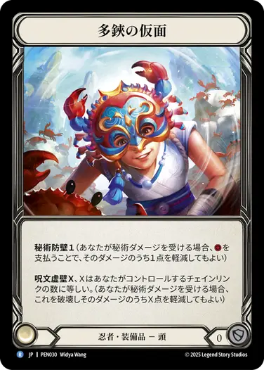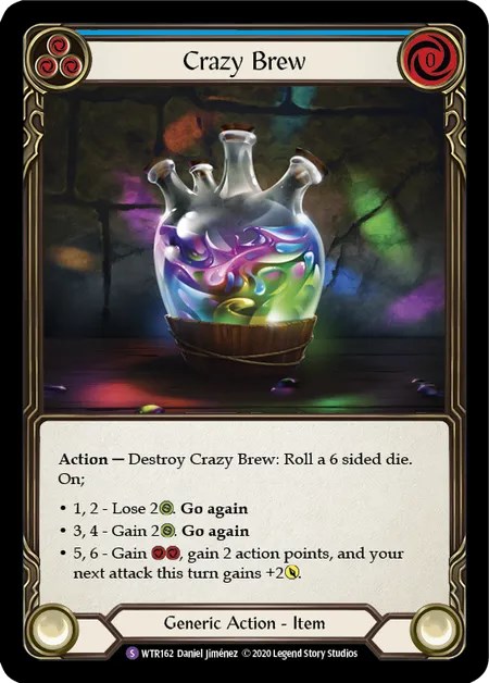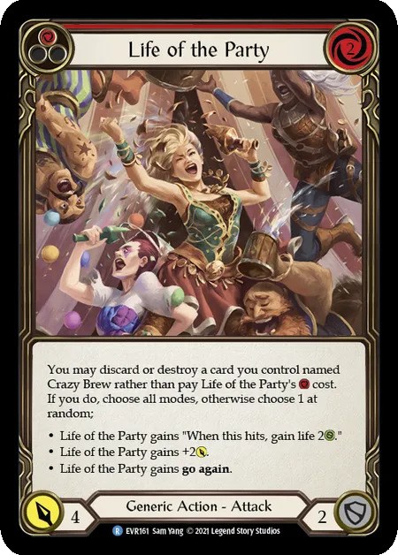 《Mask of Many Faces》で、次にプレイする攻撃アクションの名前を《Crazy Brew》にする→続行を持つ攻撃アクションをプレイする→ダメージ解決後、戦闘チェイン上の《Crazy Brew》を破壊して《Life of the Party》を0コストでプレイする、という流れが可能。