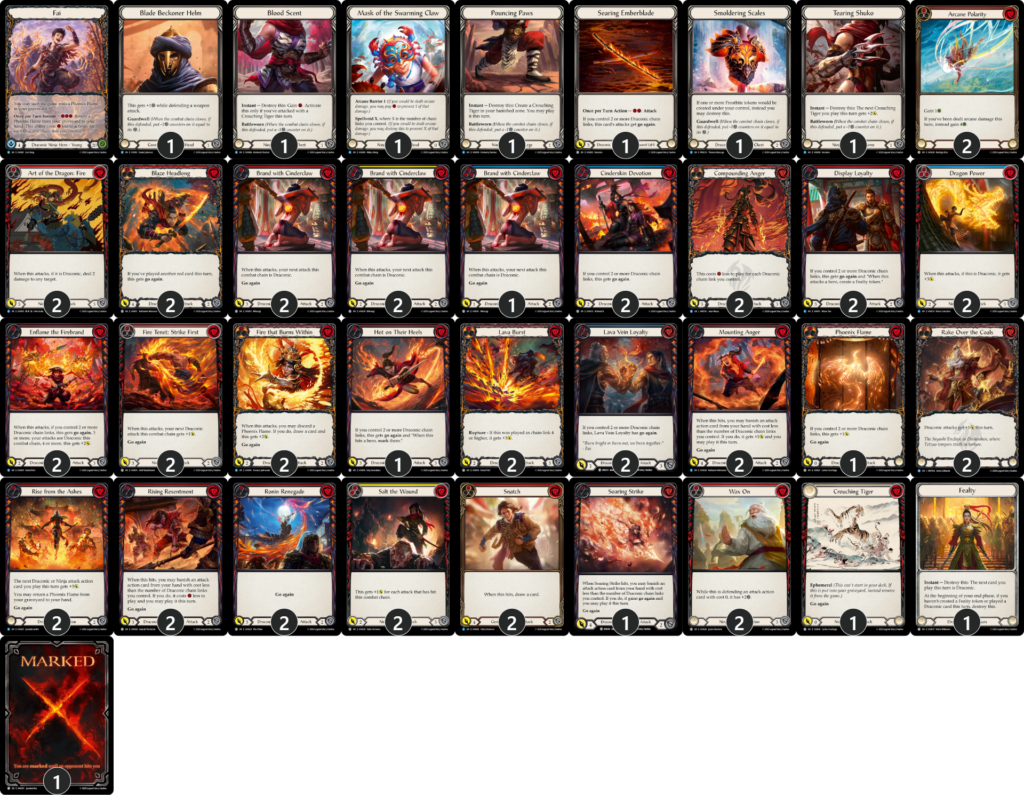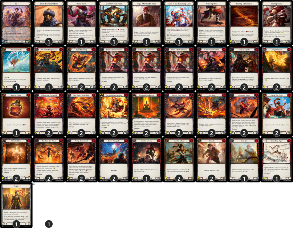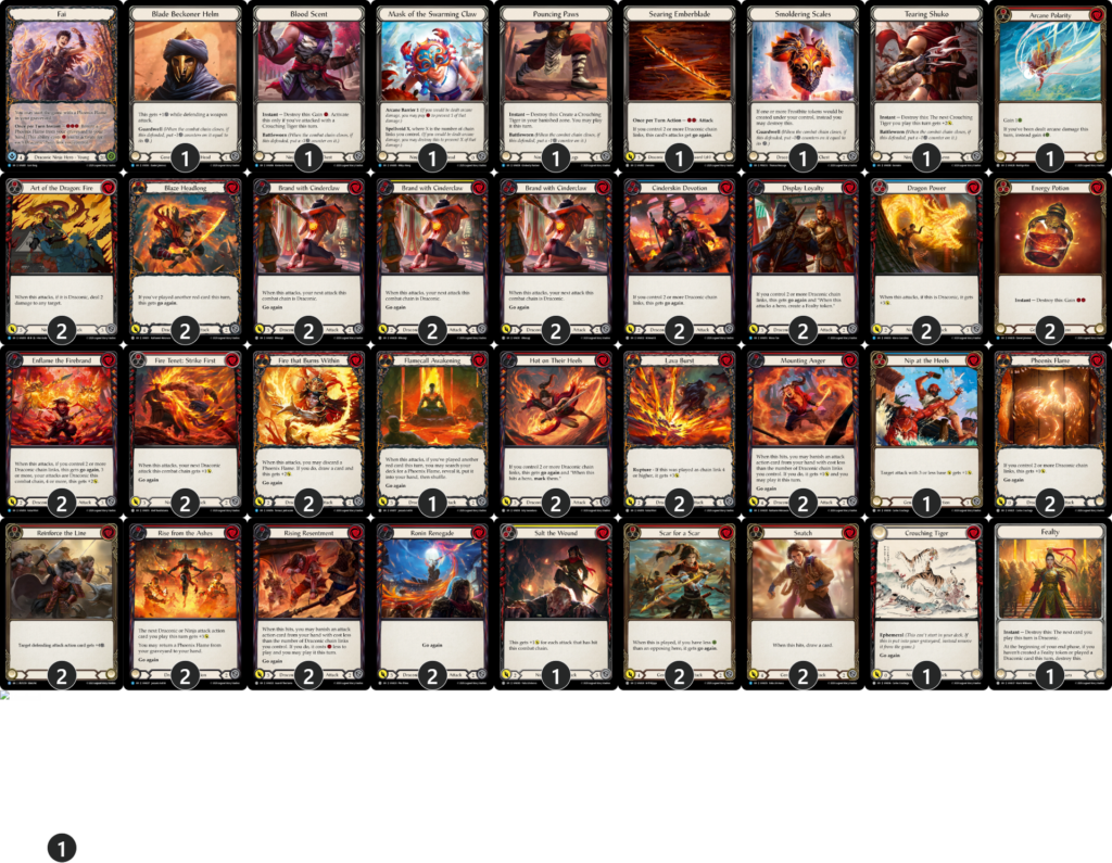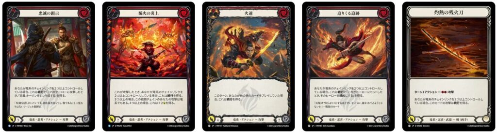 先ほど紹介したスターターの後にこれらのカードをプレイして、「竜系チェインリンク」を稼ぐのが《ファイ》の基本的な動きです。中継ぎ。《忠誠の誇示》が出す《忠義》トークンは疑似的にスターターを増やしてくれたり、竜系チェインリンクを3つにしたりと何かと便利なので、作れるときは作っておきましょう。《迫りくる追跡》の「標的」については《ファイ》にとって殆ど意味のないテキストなので気にしなくてOKです。