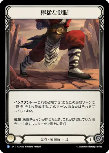 ③《血潮に燃ゆる》をプレイしたいが、リソースが足りないので、足装備《獰猛な獣脚》を起動して《臥虎》トークンを追放ゾーンに作成。その後、腕装備《引き裂く手甲》を起動。《臥虎》を2点続行としてプレイ。