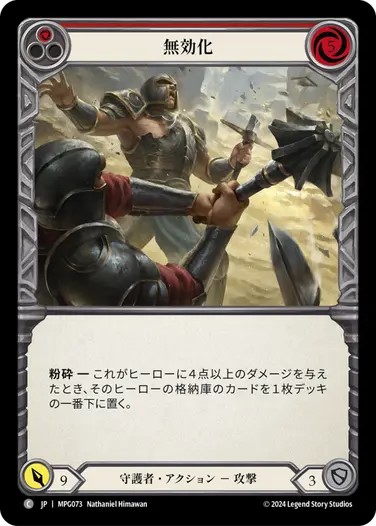 防御リアクションです。0コスト4点の攻撃アクションを多用する相手に有効。特に《スナッチ》を1枚で止めたり、《溶岩の爆発》のような0コスト5点や、《放電》や《機敏主義》のような強化が乗った0コストの攻撃に使用できるとベスト。