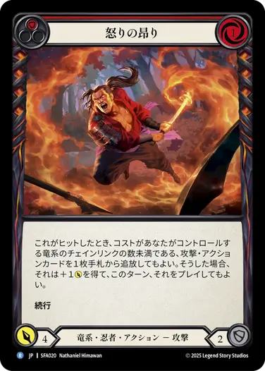 ⑤《血潮に燃ゆる》の攻撃時能力の誘発にスタックして《ファイ》の能力を起動。竜系チェインリンクが3つある(《焦爪の焼印》、竜系になった《炎の教義:口火》、《血潮に燃ゆる》)ので0コストで《不死鳥の炎》を回収。その後、《血潮に燃ゆる》の効果で《不死鳥の炎》を捨てて1ドロー。引いたカードは《浪人の反逆》。《血潮に燃ゆる》は自身の効果で+2点、《炎の教義:口火》の効果で+1点を獲得して5点続行。