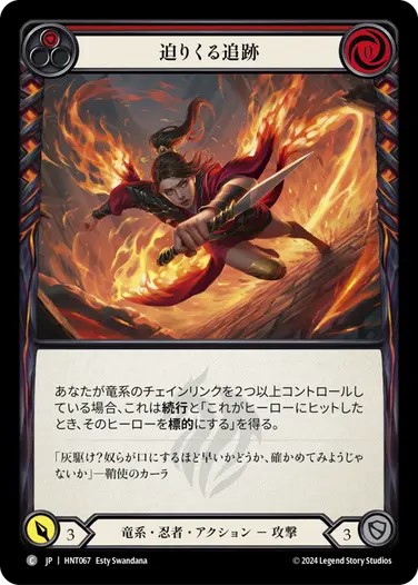 《傷には傷を》の後に《火速》ではなく《迫りくる追跡》をプレイしてしまうと、竜系チェインリンクが1つになり《迫りくる追跡》に続行が付かないので注意しましょう。