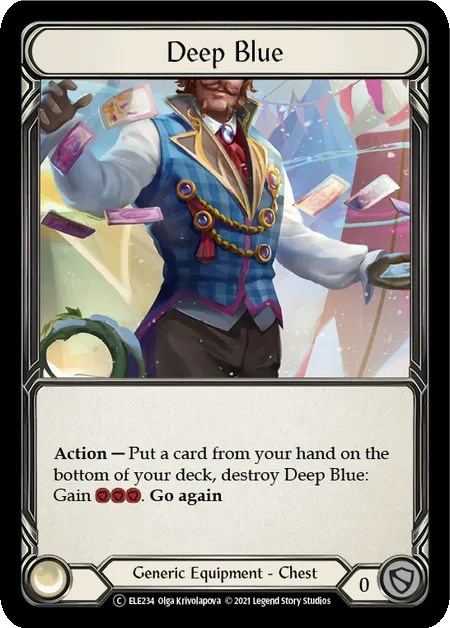 胴装備の候補となるカードです。「アクション-手札1枚をデッキの底に送り、この装備を破壊する。3リソース獲得する。続行」という効果で、要は手札1枚を疑似的な青ピッチにすることが可能。赤4枚だがリソースが必要なハンドの事故を軽減したり、素引きしたりサーチした《不死鳥の炎》をデッキの底に送ることが可能。メインから《不死鳥の炎》を2枚採用する場合、特に《Deep Blue》を装備する利点があります。