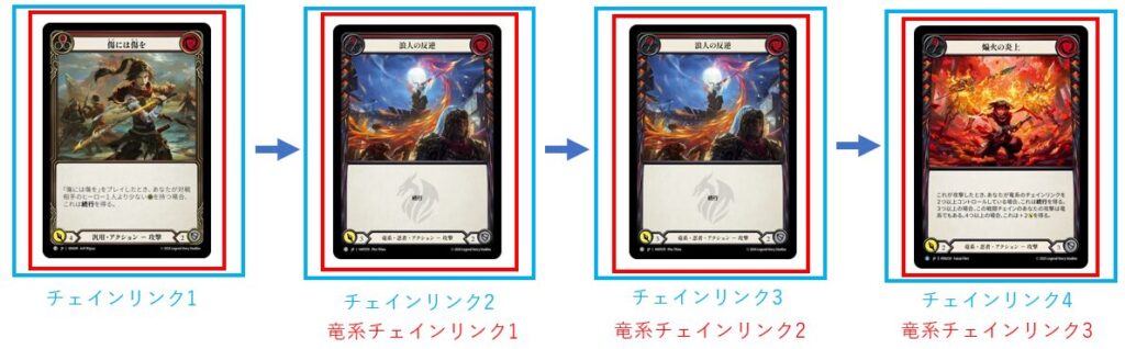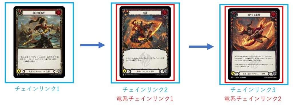 例えば《傷には傷を》で攻撃→竜系である《火速》で攻撃→竜系である《迫りくる追跡》で攻撃、という状況の竜系チェインリンクは2です。