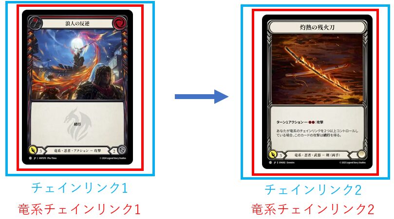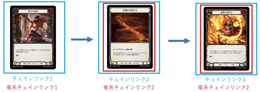 チェインリンクは攻撃として成立したタイミングでカウントされるので、竜系の攻撃→武器《灼熱の残火刀》で攻撃した場合は竜系チェインリンク2の条件を満たして《灼熱の残火刀》に「続行」が付きます。
