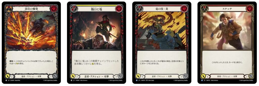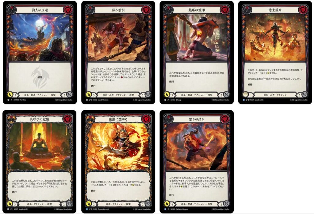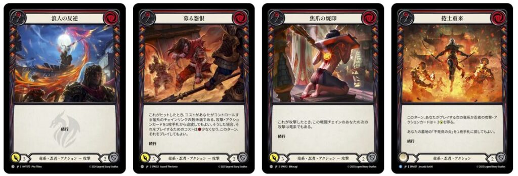 これらのカードをプレイすることから《ファイ》のターンは基本的に始まります。通称「スターター」と呼ばれます。特に、0コストで赤いカードである《浪人の反逆》《募る怨恨》《焦爪の焼印》は非常に優秀。これらを格納庫に置いてターンエンドすると、次のターンの事故率がグッと減るのでオススメのプレイになります。