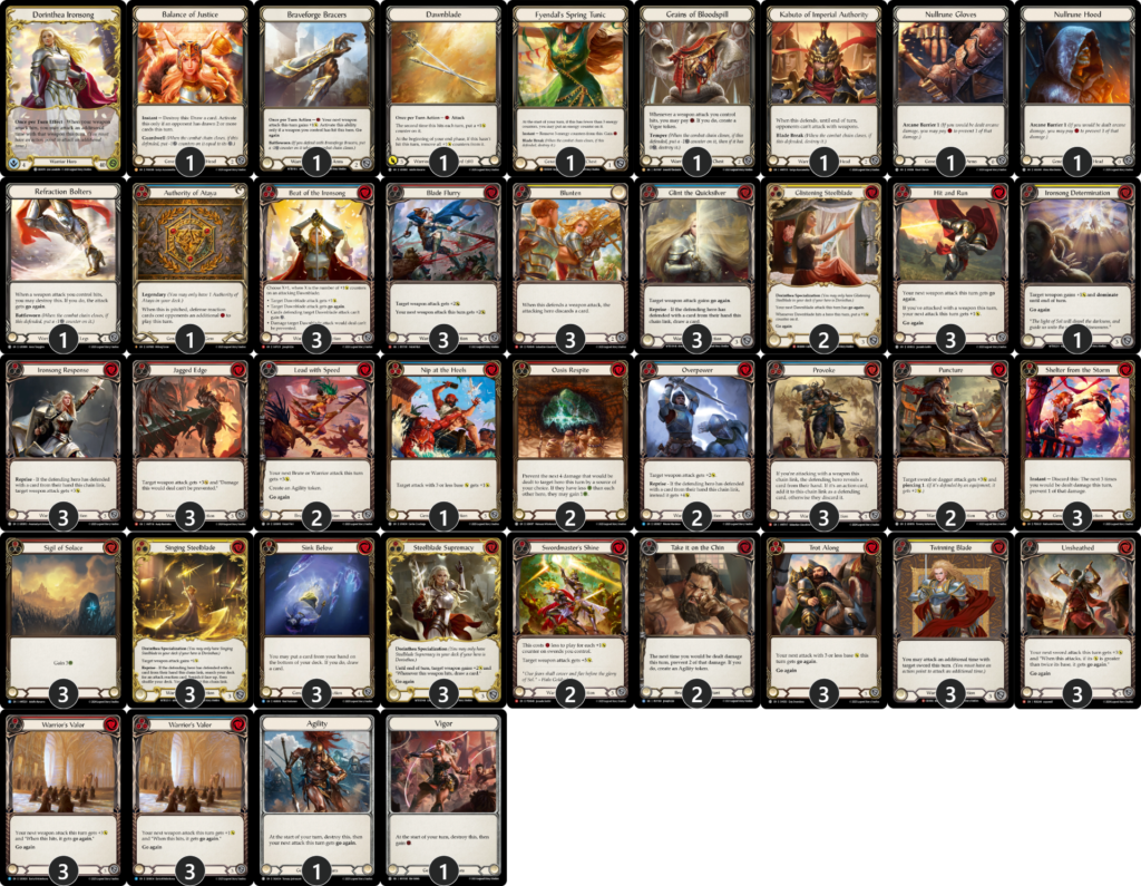 《鈍刀》は戦士クラスミラー、《アイラ》、《傀儡・アラクニ》など武器の攻撃が多い相手に強力なブロック。《ソードマスターの威光》は条件を満たしてコストが軽くなればコスパが非常に良いのは勿論、「反響」(Reprise)を満たさなくても大きなバフができる攻撃リアクションなので、格納庫からの防御リアクションや装備品で防御されて「反響」をケアしながら《黎明剣》が止められる…という剣《ドリンシア》のよくある負けパターンを解消してくれます。