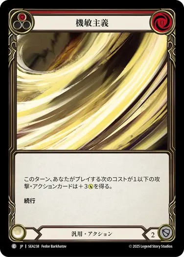 防御札としても、インスタントしても使用できる便利な稲妻インスタントです。相手の先手ターンに防御値がなくて大ダメージを受けてしまうといった事態やオンヒットの攻撃を防ぎつつ、インスタントとしていつでも捨てれる利便性を持ちます。また、《稲妻の脛当て》を起動しているコンボターンに《光速移動》を回収するためにも使用できますし、その際に稲妻カウントが1増えるのは嬉しいところ。