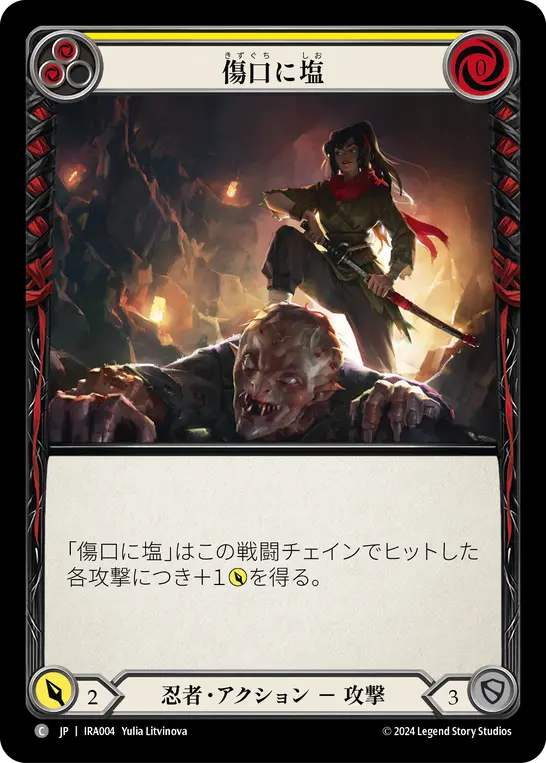 《Inflame》は単体では0コス1点-3点相当と貧弱ですが、《不死鳥の技:戦》や《Spreading Flames》の後に使えば1枚4点相当かつ、《Mask of the Pouncing Lynx》でサーチできるクローザー《傷口に塩》の強化となります。