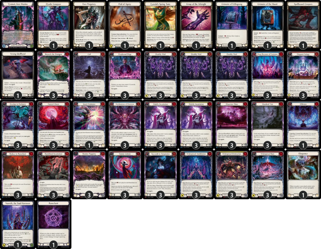 《邪悪な詠唱》を複数枚並べてから、続行付き「ルーン門」で攻撃→《邪悪な詠唱》で「ルーン陣」が出る→再び「ルーン門」で攻撃…といった連続攻撃が《Vynnset》の強力な動きですが、《死の濁流》をプレイしているとその動きをさらにビッグターンにすることが可能。《死の濁流》はおそらくファティーグを狙ってくる相手に、セットアップから打つカードとして採用されています。《銀河のソナタ》3枚により安定して《邪悪な詠唱》をサーチしたり、ルーン陣トークンを作成する能力を持つ《Deadly Wail》を9枚採用している点からも、《死の濁流》を強く活かす思想を感じますね。セットアップをする余裕がないアグロデッキ相手にも、最低限防御値3として機能するのも良い所。