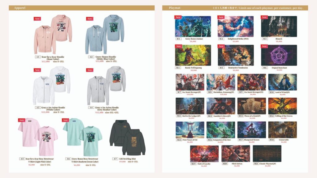 プロツアーではTシャツを始めとしたアパレルからプレイマット・スリーブなどのアクセサリの販売があります。