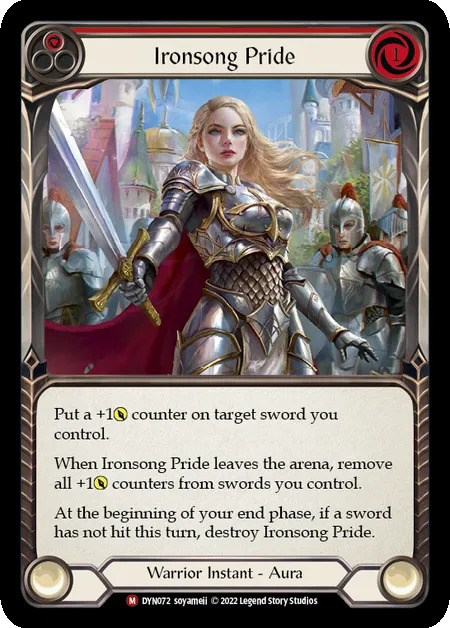 また、このリストは《Ironsong Pride》+《ソードマスターの威光》によるコンボを搭載しています。《黎明剣》の条件を満たさずとも直接+1カウンターを置ける《Ironsong Pride》により、《ソードマスターの威光》のコストを軽くして強力な攻撃リアクションにしよう!ということですね。《ソードマスターの威光》が0-1コストでプレイできるようになっていれば勝利は目前のはずです。