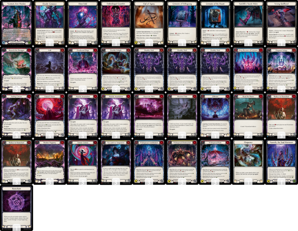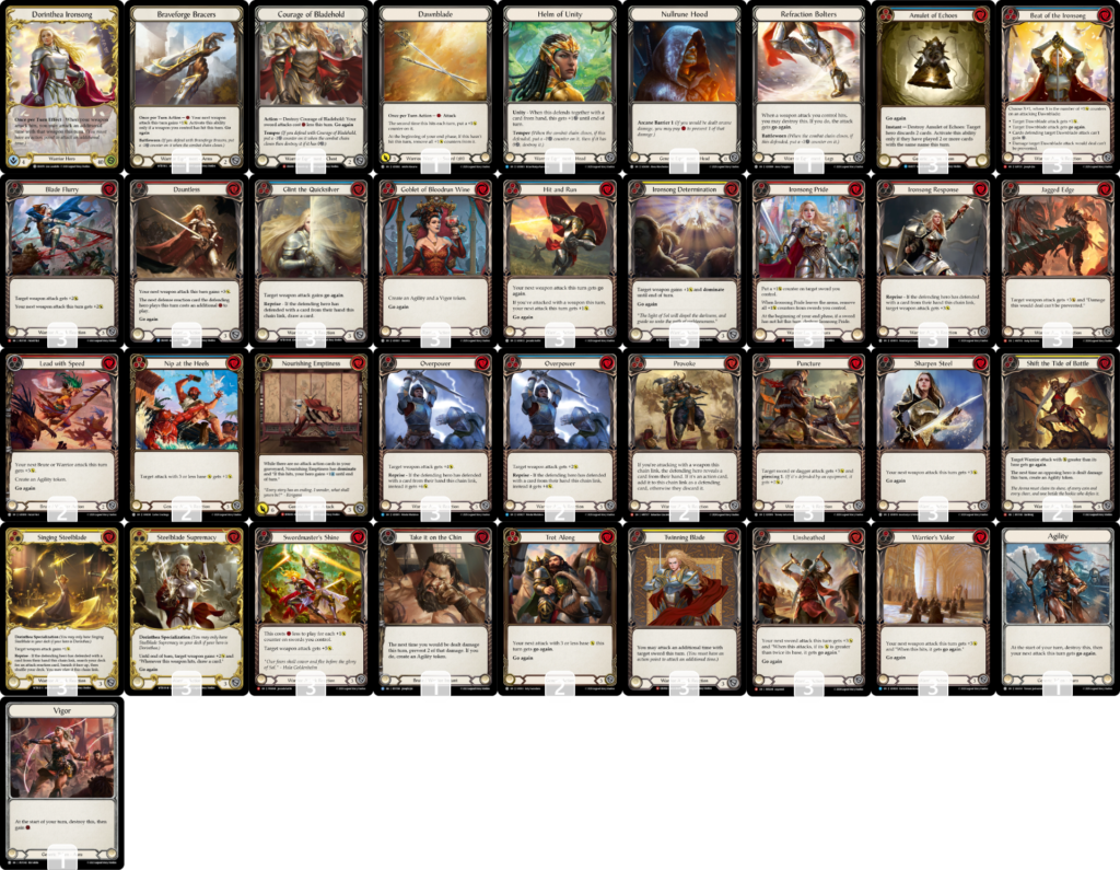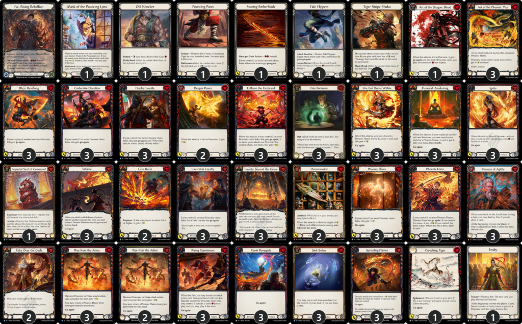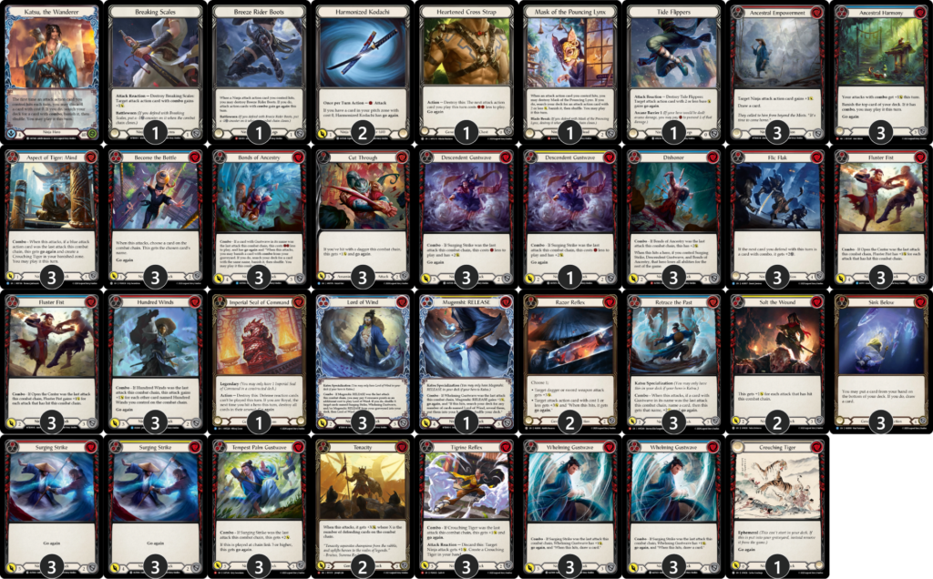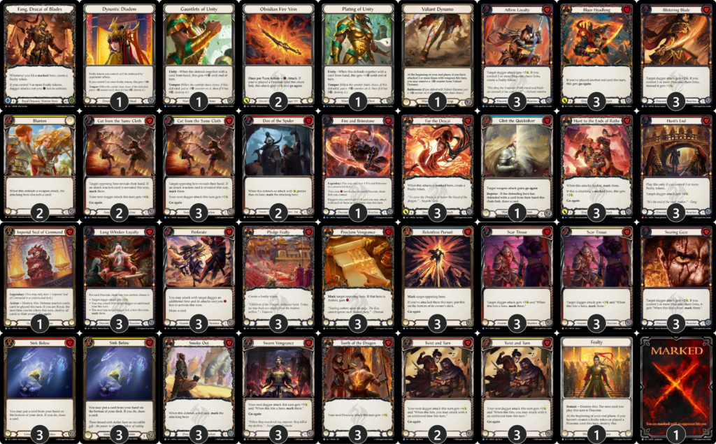 1ターン目に相手を「標的」にして2ターン目に1-2個忠義を作成、3ターン目に忠義3つ目を作成、という進行が理想的。《忠義》3つ以上達成後は、黄色や青のカードを防御に回しながら赤いカードをプレイしてピッチせずに短剣で攻撃していきましょう。