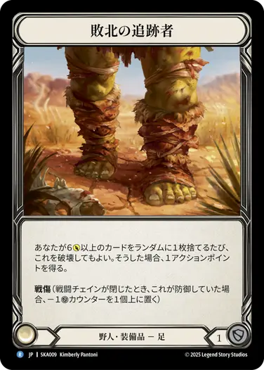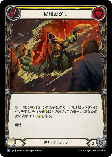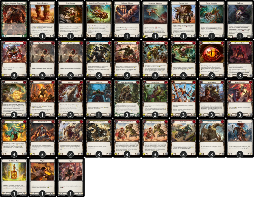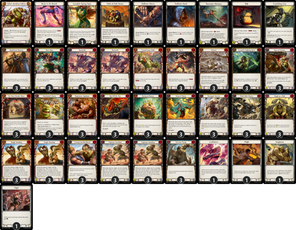 3コスト7点、ついでに軽減されないという破格の武器性能を持つ《Rok》ですが、代わりに「手札がない時のみ起動できる」という重い制約を持ちます。手札を空にした上で起動に3リソースが必要=手札から青ピッチして起動ができないため、普通は起動できません。ただ、能力でピッチが可能な《タフナット》にとっては違います。防御に3枚使用して手札を空にして《タフナット》の能力を起動して、青のカードがピッチされればそのまま《Rok》で攻撃可能。このデッキは殆ど黄色で組まれているので、黄色が公開される確率が高いですが、胴装備《フィエンダルの春のチュニック》からの1リソースや、《活力》トークンによる1リソースがあれば《Rok》を起動可能です。