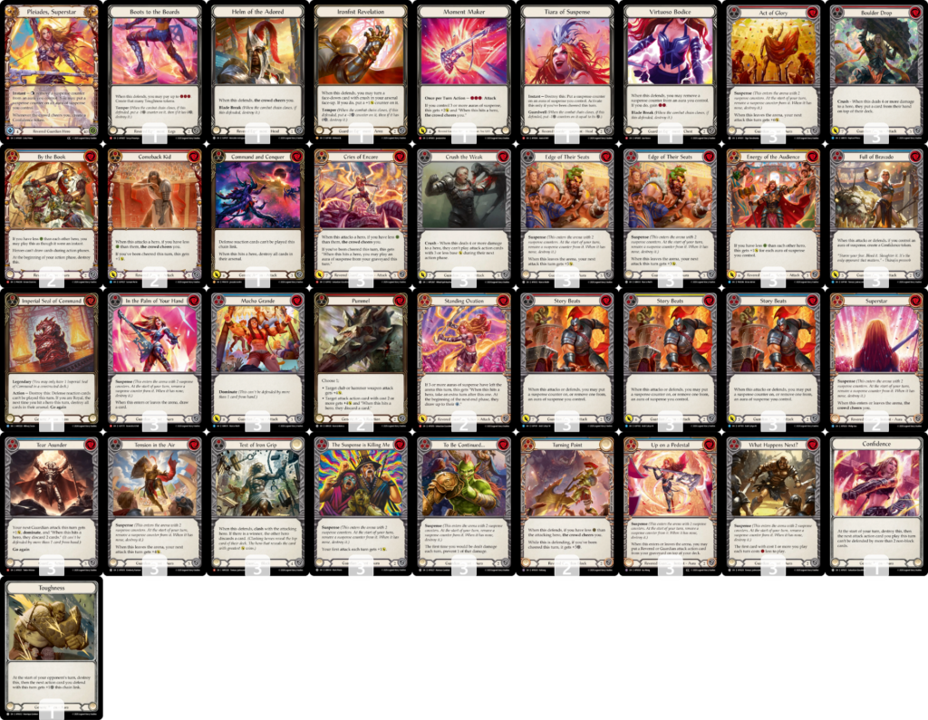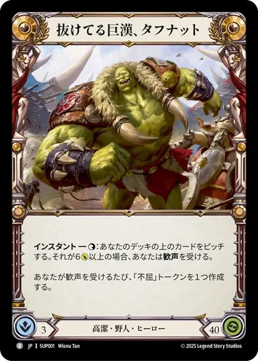 《タフナット》はCC唯一の知性3ヒーロー!手札が少ないという強烈なデメリットを持ちますが…代わりにデッキトップからピッチする能力により疑似的に手札4枚の戦いが可能です。また、高潔タレントを持ち、「歓声」を受けていると強化されるカードを扱います。ヒーロー能力で出る《不屈》トークンは防御値を高める効果を持っており、少ない手札でもしっかり防御することが可能です。