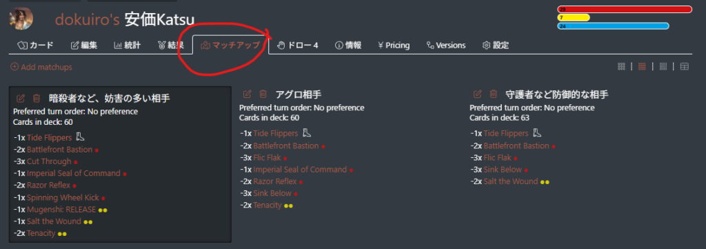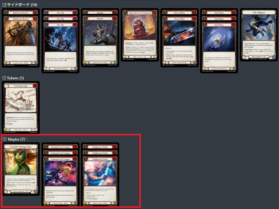 Fabraryリンク内には「アグロ相手にはこのカードを抜いてこのカードを入れよう」「ファティーグ相手の場合はこう!」といった大まかなマッチアップも準備。