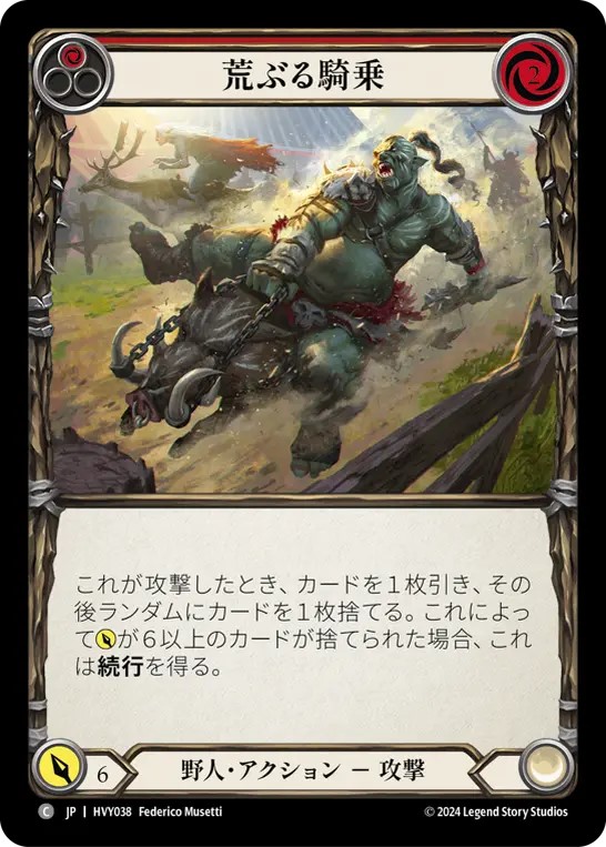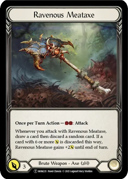 続行の付く《荒ぶる騎乗》や《押し潰し》がある場合、それらの続行から入って→武器《Ravenous Meataxe》の動きができれば3枚で11点+威嚇2回の動きが狙えます。