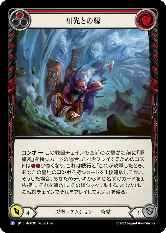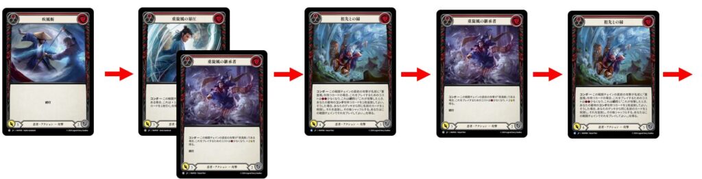 コンボが綺麗につながった時の爆発力は全ヒーローでもトップクラス!理想のコンボは《疾風斬》→《重旋風の暴圧》or《重旋風の継承者》→《祖先との縁》→《重旋風の継承者》→《祖先との縁》で追放した《祖先との縁》…という《祖先との縁》を2回以上使用するコンボです。この連鎖に成功すると1ターン中に30点以上出すことも狙えます!