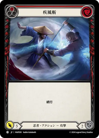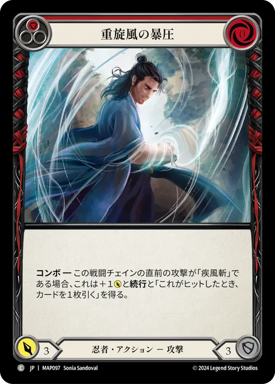 忍者クラスは連続攻撃を得意とするクラスですが、《カツ》は忍者の中でも「コンボ」カードに特化したヒーロー。ヒーロー能力も「コンボ」カードをサーチするものになっています。「コンボ」ギミックは一つ前の攻撃がコンボの条件を満たしている場合、強化される効果です。例えば《重旋風の暴圧》は普通にプレイすると0コスト3点の弱いカードですが、《疾風斬》の後にプレイすれば4点続行ヒット時1ドローになります。